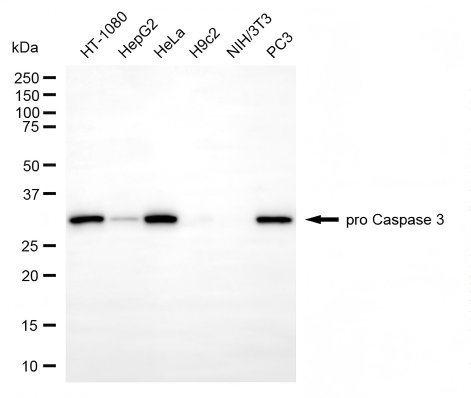 Western blotting analysis using pro caspase 3 antibody. Total cell lysates (30 μg) from various cell lines were loaded and separated by SDS-PAGE. The blot was incubated with pro caspase 3 antibody and HRP-conjugated goat anti-rabbit secondary antibody respectively.