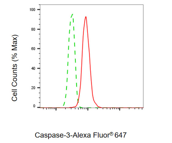 Flow cytometric analysis of Caspase-3 expression in HT-1080 cells using Caspase-3 antibody. Green, isotype control; red, Caspase-3.