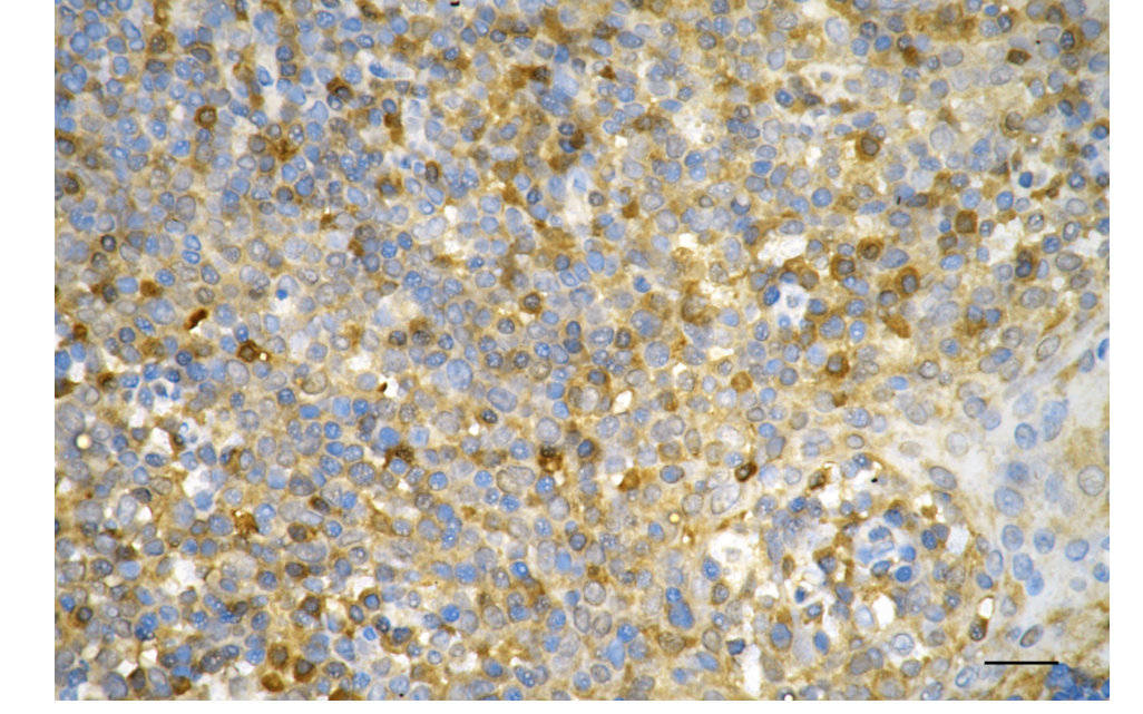 Immunohistochemistry was performed on paraffin-embedded human tonsillitis using caspase-3 antibody. Antigen retrieval was done in sodium citrate buffer (pH 6.0). DAB was used for detection, with hematoxylin counterstaining. Images were acquired using a Nikon Ci-L Plus microscope (40× objective). Scale bar: 25 μm.