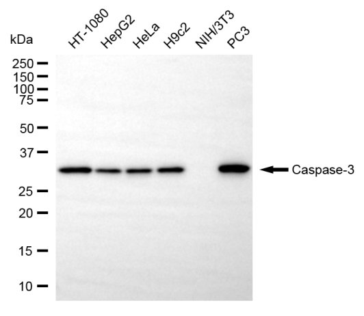 Western blotting analysis using caspase-3 antibody. Total cell lysates (30 μg) from various cell lines were loaded and separated by SDS-PAGE. The blot was incubated with caspase-3 antibody and HRP-conjugated goat anti-rabbit secondary antibody respectively.