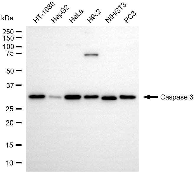 Western blotting analysis using caspase 3 antibody. Total cell lysates (30 μg) from various cell lines were loaded and separated by SDS-PAGE. The blot was incubated with caspase 3 antibody and HRP-conjugated goat anti-rabbit secondary antibody respectively.