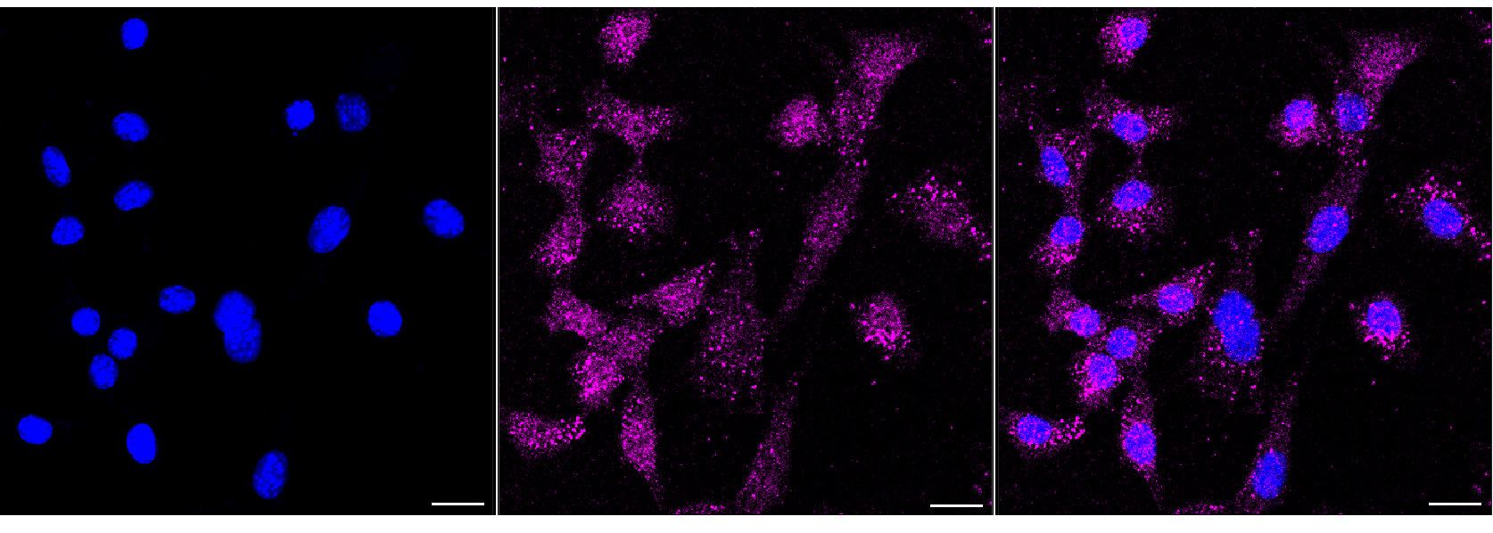 Immunocytochemical staining of C2C12 cells with Caspase 6 antibody. Nuclei were stained blue with DAPI; Caspase 6 was stained magenta with Alexa Fluor? 647. Images were taken using Leica stellaris 5. Protein abundance based on laser Intensity and smart gain: Low. Scale bar, 20 μm.