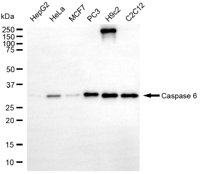 Western blotting analysis using caspase 6 antibody. Total cell lysates (30 μg) from various cell lines were loaded and separated by SDS-PAGE. The blot was incubated with caspase 6 antibody and HRP-conjugated goat anti-rabbit secondary antibody respectively.