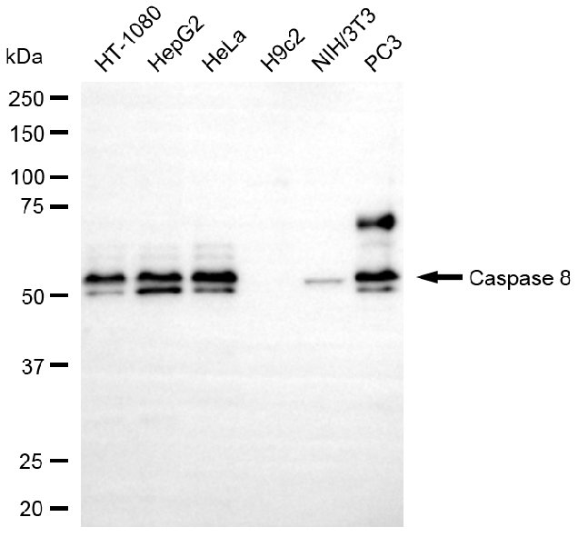 Western blotting analysis using caspase 8 antibody. Total cell lysates (30 μg) from various cell lines were loaded and separated by SDS-PAGE. The blot was incubated with caspase 8 antibody and HRP-conjugated goat anti-rabbit secondary antibody respectively.