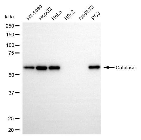 Western blotting analysis using catalase antibody. Total cell lysates (30 μg) from various cell lines were loaded and separated by SDS-PAGE. The blot was incubated with catalase antibody and HRP-conjugated goat anti-rabbit secondary antibody respectively.