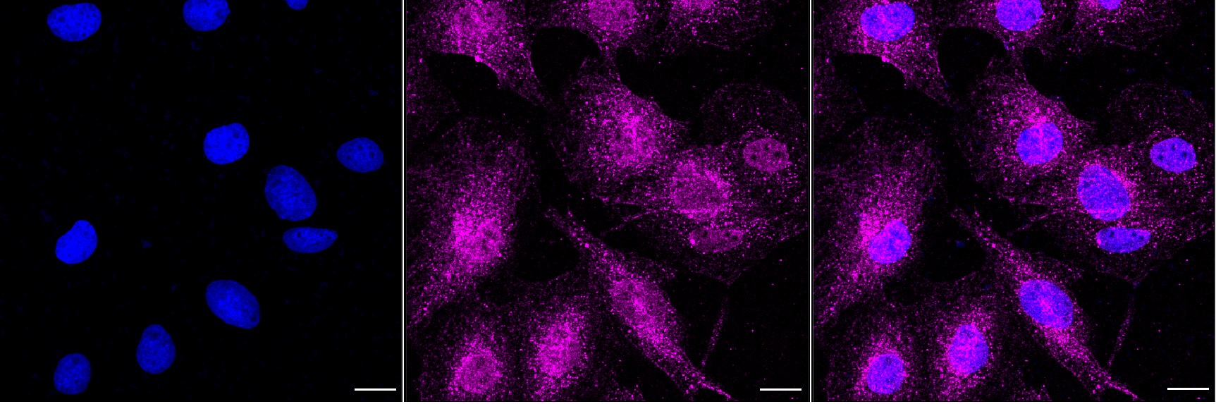 Immunocytochemical staining of H9c2 cells with Caveolin 3 antibody. Nuclei were stained blue with DAPI; Caveolin 3 was stained magenta with Alexa Fluor? 647. Images were taken using Leica stellaris 5. Protein abundance based on laser Intensity and smart gain: Medium. Scale bar, 20 μm.
