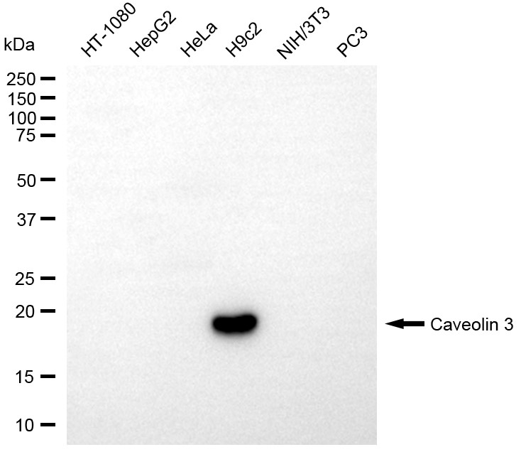 Western blotting analysis using caveolin 3 antibody. Total cell lysates (30 μg) from various cell lines were loaded and separated by SDS-PAGE. The blot was incubated with caveolin 3 antibody and HRP-conjugated goat anti-rabbit secondary antibody respectively.