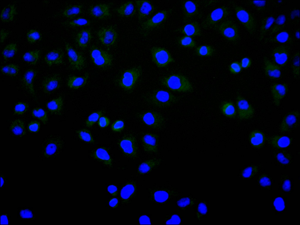 Immunofluorescence staining of HeLa cell with CSB-RA937256A0HU at 1:50 , counter-stained with DAPI. The cells were fixed in 4% formaldehyde, permeabilized using 0.2% Triton X-100 and blocked in 10% normal Goat Serum. The cells were then incubated with the antibody overnight at 4°C. The secondary antibody was Alexa Fluor 488-congugated AffiniPure Goat Anti-Rabbit IgG(H+L).