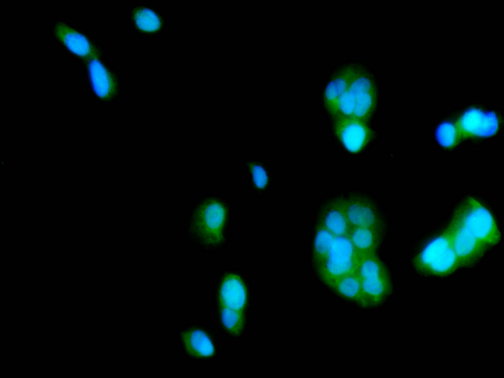 Immunofluorescence staining of HepG2 cell with CSB-RA935966A0HU at 1:50 , counter-stained with DAPI. The cells were fixed in 4% formaldehyde, permeabilized using 0.2% Triton X-100 and blocked in 10% normal Goat Serum. The cells were then incubated with the antibody overnight at 4°C. The secondary antibody was Alexa Fluor 488-congugated AffiniPure Goat Anti-Rabbit IgG(H+L).