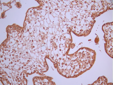 IHC image of CSB-RA935966A0HU diluted at 1:100 and staining in paraffin-embedded human placenta tissue performed on a Leica BondTM system. After dewaxing and hydration, antigen retrieval was mediated by high pressure in a citrate buffer (pH 6.0). Section was blocked with 10% normal goat serum 30min at RT. Then primary antibody (1% BSA) was incubated at 4°C overnight. The primary is detected by a Goat anti-rabbit polymer IgG labeled by HRP and visualized using 0.05% DAB.