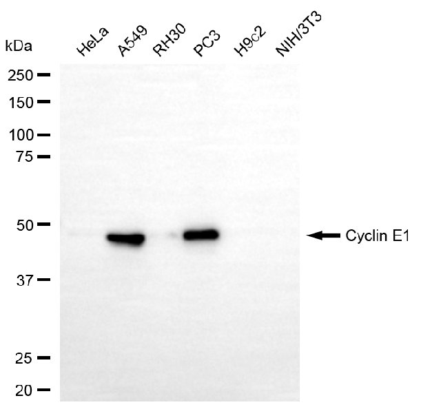 Western blotting analysis using cyclin E1 antibody. Total cell lysates (30 μg) from various cell lines were loaded and separated by SDS-PAGE. The blot was incubated with cyclin E1 antibody and HRP-conjugated goat anti-rabbit secondary antibody respectively.