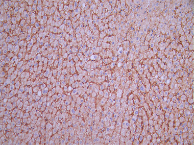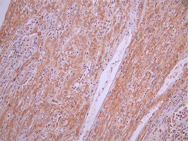 IHC image of CSB-RA139995A0HU diluted at 1:100 and staining in paraffin-embedded human liver tissue performed on a Leica BondTM system. After dewaxing and hydration, antigen retrieval was mediated by high pressure in a citrate buffer (pH 6.0). Section was blocked with 10% normal goat serum 30min at RT. Then primary antibody (1% BSA) was incubated at 4°C overnight. The primary is detected by a Goat anti-rabbit polymer IgG labeled by HRP and visualized using 0.05% DAB.