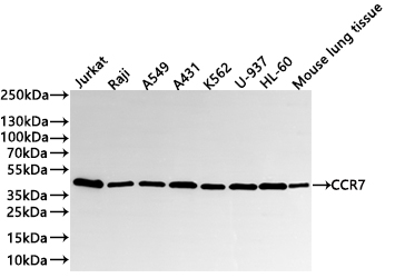 Positive WB detected in: Jurkat whole cell lysate(30μg), Raji whole cell lysate(30μg), A549 whole cell lysate(30μg), A431 whole cell lysate(30μg), K562 whole cell lysate(30μg), U-937 whole cell lysate(30μg), HL-60 whole cell lysate(30μg), Mouse lung tissue lysate(30μg)