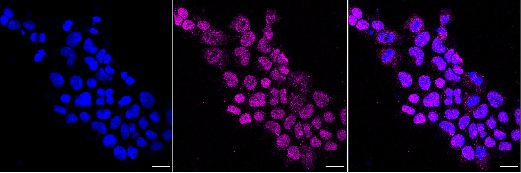 Immunocytochemical staining of Hela cells with CD163 antibody. Nuclei were stained blue with DAPI; CD163 was stained magenta with Alexa Fluor? 647. Images were taken using Leica stellaris 5. Protein abundance based on laser Intensity and smart gain: Medium. Scale bar, 20 μm.