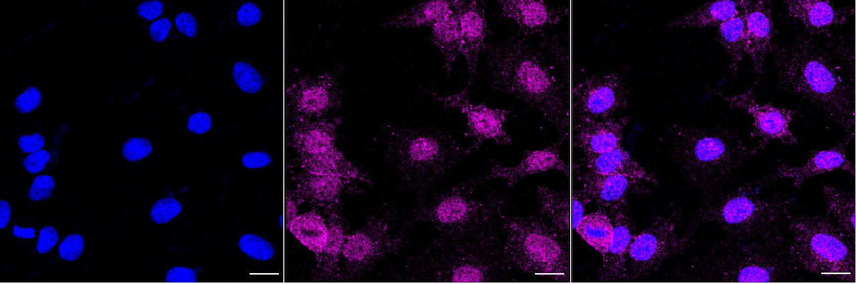 Immunocytochemical staining of Hela cells with CD276 antibody. Nuclei were stained blue with DAPI; CD276 was stained magenta with Alexa Fluor? 647. Images were taken using Leica stellaris 5. Protein abundance based on laser Intensity and smart gain: Low. Scale bar, 20 μm.