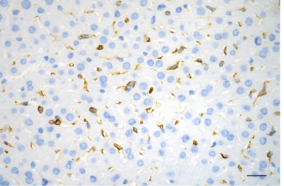 Immunohistochemistry was performed on paraffin-embedded mouse liver using CD44 antibody. Antigen retrieval was done in sodium citrate buffer (pH 6.0). DAB was used for detection, with hematoxylin counterstaining. Images were acquired using a Nikon Ci-L Plus microscope (40× objective). Scale bar: 25 μm.