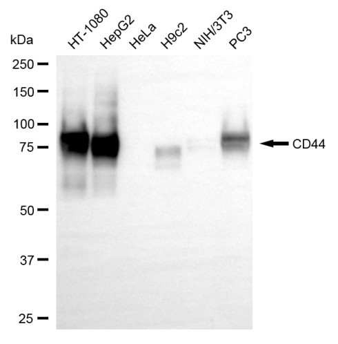 Western blotting analysis using CD44 antibody. Total cell lysates (30 μg) from various cell lines were loaded and separated by SDS-PAGE. The blot was incubated with CD44 antibody and HRP-conjugated goat anti-rabbit secondary antibody respectively.