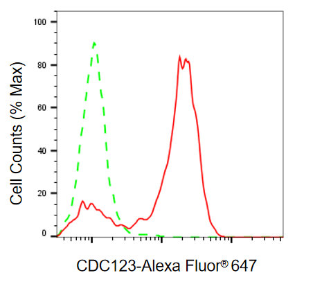 Flow cytometric analysis of CDC123 expression in HAP-1 cells using CDC123 antibody. Green, isotype control; red, CDC123.