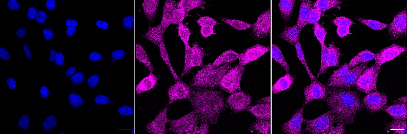 Immunocytochemical staining of HAP1 cells with CDC123 antibody. Nuclei were stained blue with DAPI;CDC123 was stained magenta with Alexa Fluor? 647. Images were taken using Leica stellaris 5. Protein abundance based on laser Intensity and smart gain: Medium. Scale bar, 20 μm.