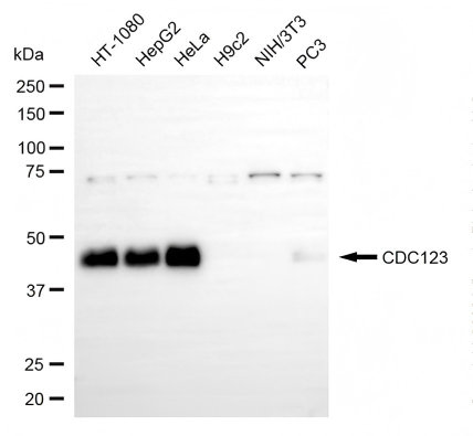 Western blotting analysis using CDC123 antibody. Total cell lysates (30 μg) from various cell lines were loaded and separated by SDS-PAGE. The blot was incubated with CDC123 antibody and HRP-conjugated goat anti-rabbit secondary antibody respectively.