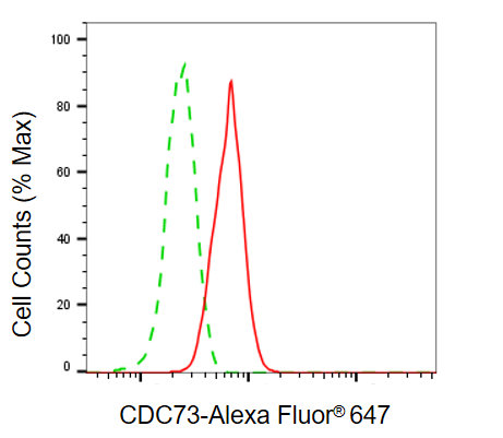 Flow cytometric analysis of CDC73 expression in C2C12 cells using CDC73 antibody. Green, isotype control; red, CDC73.