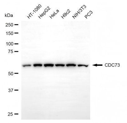 Western blotting analysis using CDC73 antibody. Total cell lysates (30 μg) from various cell lines were loaded and separated by SDS-PAGE. The blot was incubated with CDC73 antibody and HRP-conjugated goat anti-rabbit secondary antibody respectively.