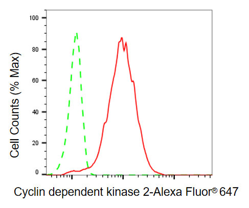 Flow cytometric analysis of cyclin dependent kinase 2 expression in HepG2 cells using cyclin dependent kinase 2 antibody. Green, isotype control; red, cyclin dependent kinase 2.