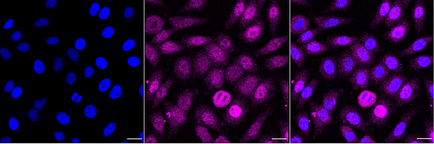 Immunocytochemical staining of HepG2 cells with Cyclin dependent kinase 2 antibody. Nuclei were stained blue with DAPI; Cyclin dependent kinase 2 was stained magenta with Alexa Fluor? 647. Images were taken using Leica stellaris 5. Protein abundance based on laser Intensity and smart gain: Low. Scale bar, 20 μm.