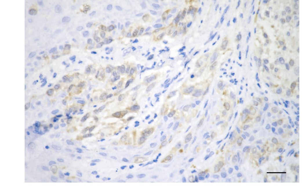 Immunohistochemistry was performed on paraffin-embedded human melanoma using cyclin dependent kinase 2 antibody. Antigen retrieval was done in sodium citrate buffer (pH 6.0). DAB was used for detection, with hematoxylin counterstaining. Images were acquired using a Nikon Ci-L Plus microscope (40× objective). Scale bar: 25 μm.