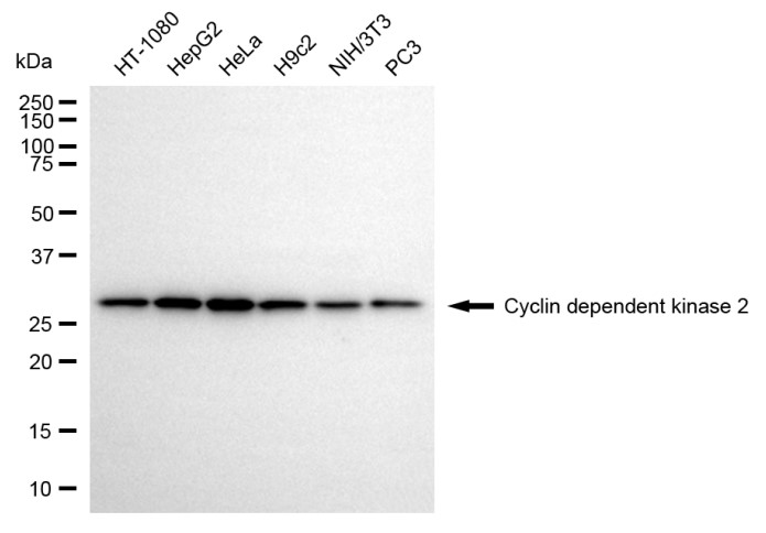 Western blotting analysis using cyclin dependent kinase 2 antibody. Total cell lysates (30 μg) from various cell lines were loaded and separated by SDS-PAGE. The blot was incubated with cyclin dependent kinase 2 antibody and HRP-conjugated goat anti-rabbit secondary antibody respectively.