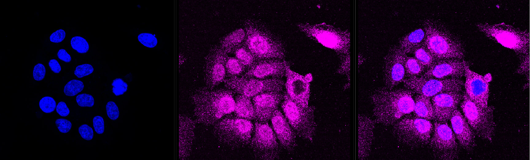 Immunocytochemical staining of HepG2 cells with Cdk4 antibody. Nuclei were stained blue with DAPI; Cdk4 was stained magenta with Alexa Fluor? 647. Images were taken using Leica stellaris 5. Protein abundance based on laser Intensity and smart gain: Medium. Scale bar, 20 μm.