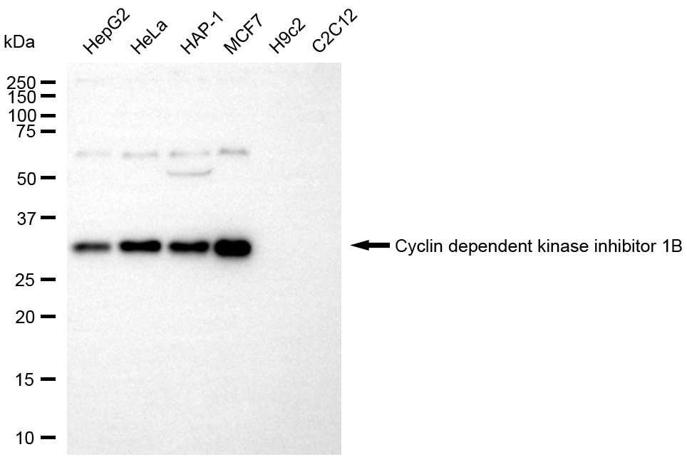 Western blotting analysis using Cyclin dependent kinase inhibitor 1B antibody. Total cell lysates (30 μg) from various cell lines were loaded and separated by SDS-PAGE. The blot was incubated with Cyclin dependent kinase inhibitor 1B antibody and HRP-conjugated goat anti-rabbit secondary antibody respectively.