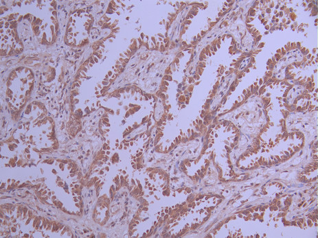 IHC image of CSB-RA914462A0HU diluted at 1:100 and staining in paraffin-embedded human lung cancer performed on a Leica BondTM system. After dewaxing and hydration, antigen retrieval was mediated by high pressure in a citrate buffer (pH 6.0). Section was blocked with 10% normal goat serum 30min at RT. Then primary antibody (1% BSA) was incubated at 4°C overnight. The primary is detected by a Goat anti-rabbit polymer IgG labeled by HRP and visualized using 0.05% DAB.