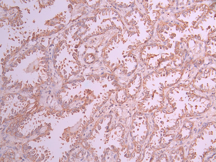 IHC image of CSB-RA579787A0HU diluted at 1:100 and staining in paraffin-embedded human lung cancer performed on a Leica BondTM system. After dewaxing and hydration, antigen retrieval was mediated by high pressure in a citrate buffer (pH 6.0). Section was blocked with 10% normal goat serum 30min at RT. Then primary antibody (1% BSA) was incubated at 4°C overnight. The primary is detected by a Goat anti-rabbit polymer IgG labeled by HRP and visualized using 0.05% DAB.