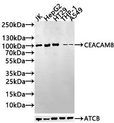Positive WB detected in: JK whole cell lysate(30μg), HepG2 whole cell lysate(30μg), HT29 whole cell lysate(30μg), THP-1 whole cell lysate(30μg), A549 whole cell lysate(30μg)