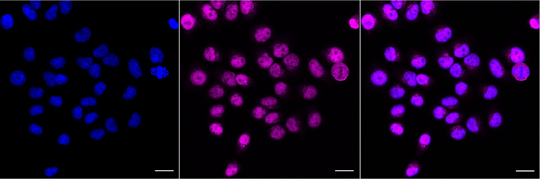 Immunocytochemical staining of HepG2 cells with Chromodomain helicase DNA binding protein 4 antibody. Nuclei were stained blue with DAPI; Chromodomain helicase DNA binding protein 4 was stained magenta with Alexa Fluor? 647. Images were taken using Leica stellaris 5. Protein abundance based on laser Intensity and smart gain: High. Scale bar, 20 μm.