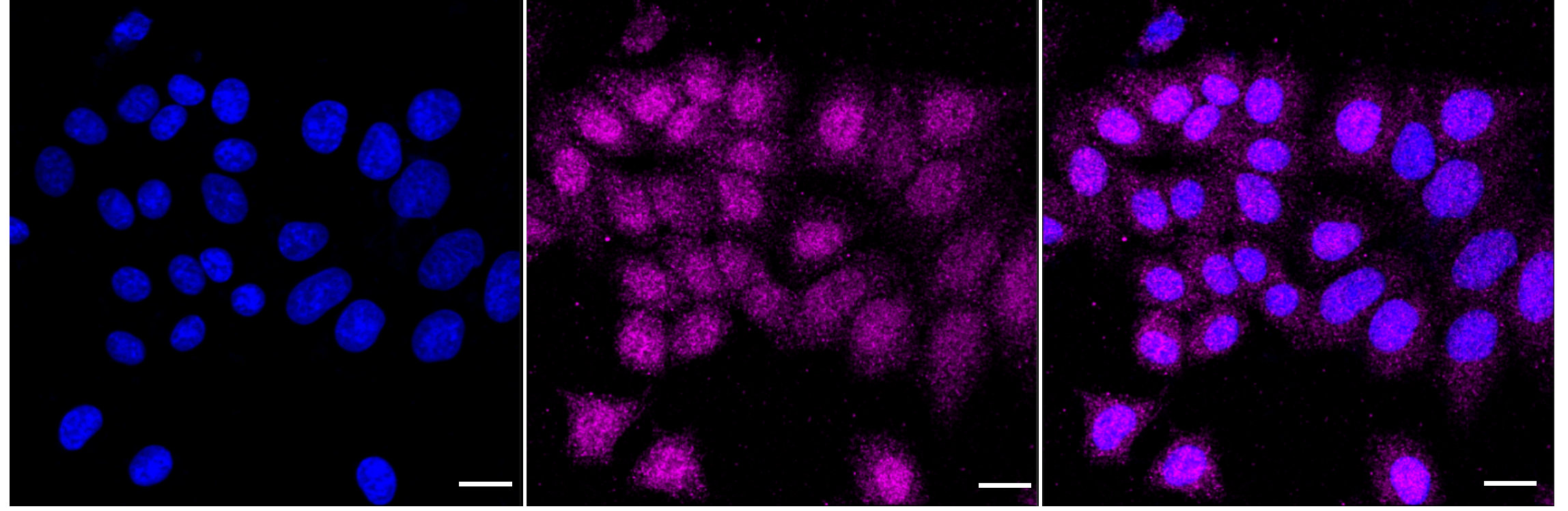 Immunocytochemical staining of HepG2 cells with Checkpoint kinase 1 antibody. Nuclei were stained blue with DAPI; Checkpoint kinase 1 was stained magenta with Alexa Fluor? 647. Images were taken using Leica stellaris 5. Protein abundance based on laser Intensity and smart gain: Medium. Scale bar: 20 μm.