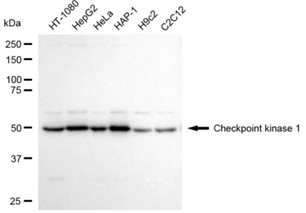 Western blotting analysis using Checkpoint kinase 1 antibody. Total cell lysates (30 μg) from various cell lines were loaded and separated by SDS-PAGE. The blot was incubated with Checkpoint kinase 1 antibody and HRP-conjugated goat anti-rabbit secondary antibody respectively.