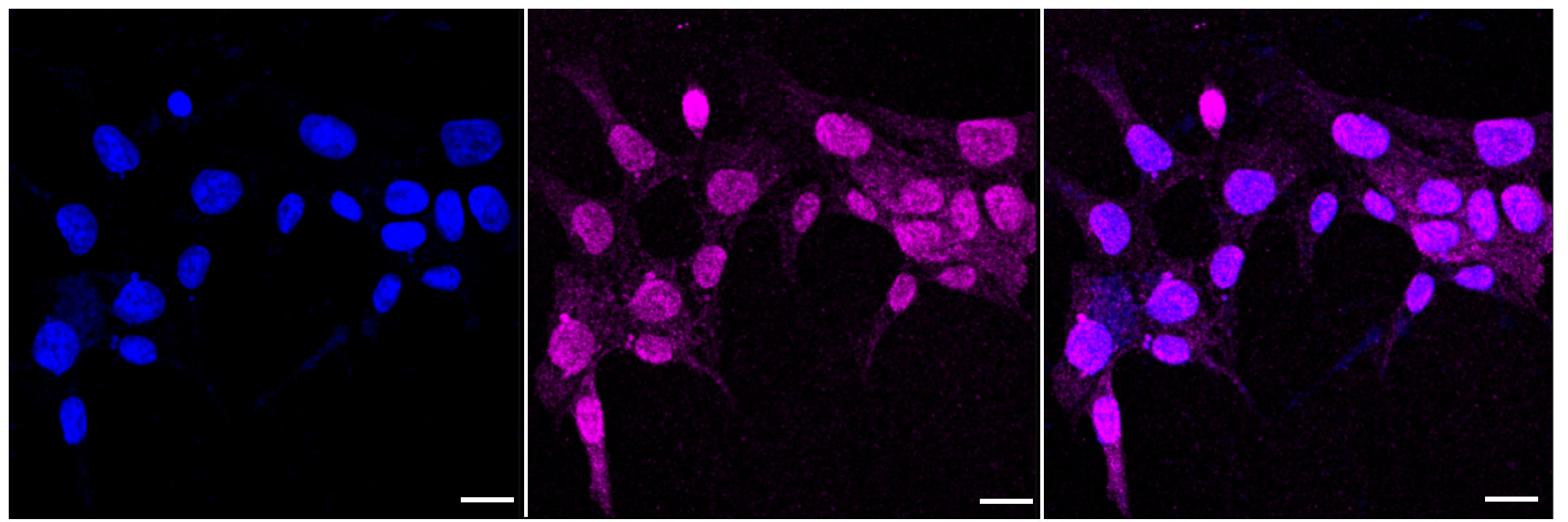 Immunocytochemical staining of HAP-1 cells with Creatine kinase B?antibody. Nuclei were stained blue with DAPI; Creatine kinase B?was stained magenta with Alexa Fluor? 647. Images were taken using Leica stellaris 5. Protein abundance based on laser Intensity and smart gain: Medium. Scale bar: 20 μm.