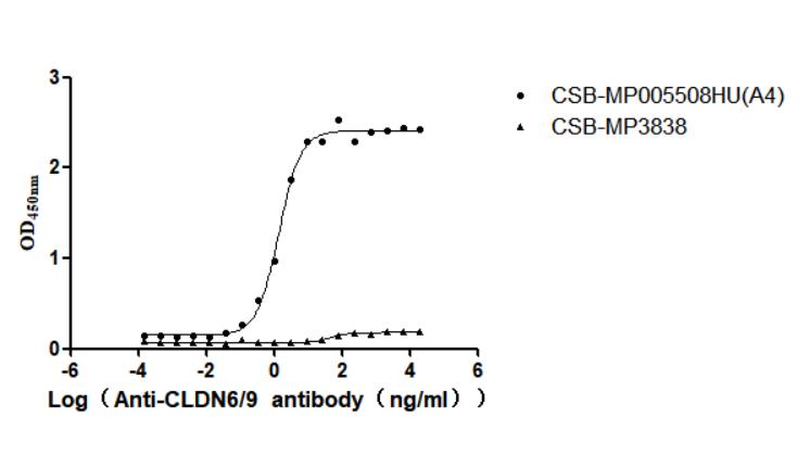 Activity: Measured by its binding ability in a functional ELISA. Immobilized Human CLDN6 (CSB-MP005508HU(A4)) at 10 μg/mL can bind Anti-CLDN6-9 recombinant antibody. The EC50 is 1.189-1.618 ng/mL. The VLPs (CSB-MP3838) is negative control. -
