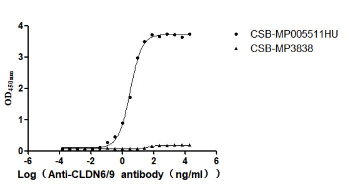 Activity: Measured by its binding ability in a functional ELISA. Immobilized Human CLDN6-9 (CSB-MP005511HU) at 10 μg/mL can bind Anti-CLDN6-9 recombinant antibody. The EC50 is 2.876-3.657 ng/mL. The VLPs (CSB-MP3838) is negative control. -