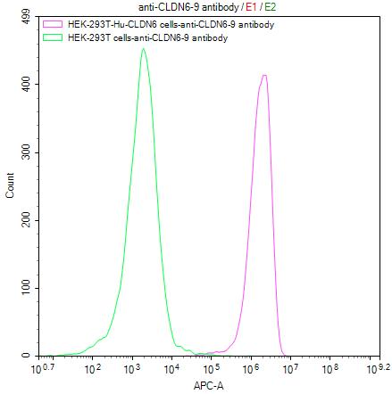 Untransfected HEK-293T cells (green line) and transfected Human CLDN9 HEK-293T stable cells (red line) were stained with anti-CLDN6/9 antibody (CSB-RA005508MA3HU) (2μg/1*106cells), washed and then followed by APC-conjugated anti-Mouse IgG Fc antibody and analyzed with flow cytometry.