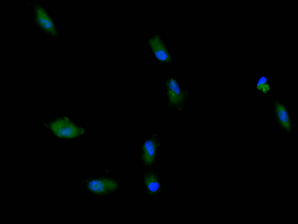 Immunofluorescence staining of A549 cell with CSB-RA005595MA2HU at 1:30 ,counter-stained with DAPI. The cells were fixed in 4% formaldehyde, permeabilized using 0.2% Triton X-100 and blocked in 10% normal Goat Serum. The cells were then incubated with the antibody overnight at 4°C. The secondary antibody was Alexa Fluor 488-congugated AffiniPure Goat Anti-Human IgG(H+L).