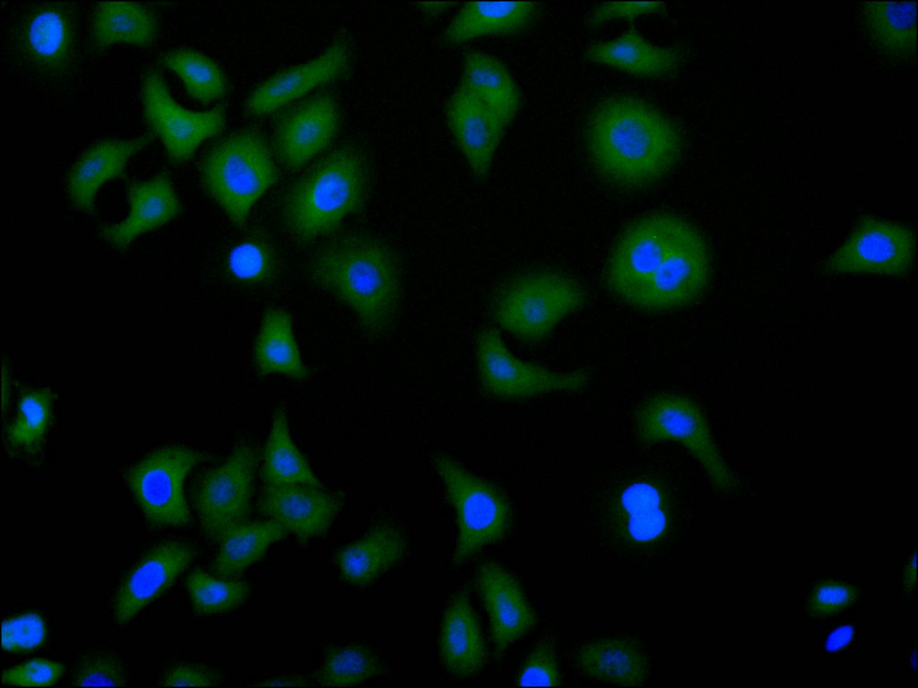 Immunofluorescence staining of Hela cell with CSB-RA005595MA2HU at 1:30 ,counter-stained with DAPI. The cells were fixed in 4% formaldehyde, permeabilized using 0.2% Triton X-100 and blocked in 10% normal Goat Serum. The cells were then incubated with the antibody overnight at 4°C. The secondary antibody was Alexa Fluor 488-congugated AffiniPure Goat Anti-Human IgG(H+L).