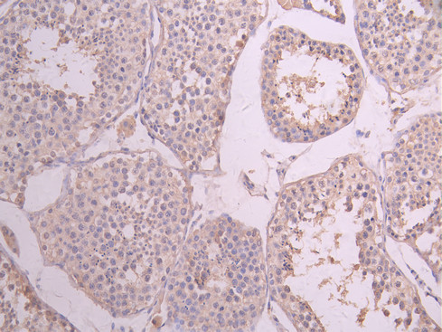 IHC image of CSB-RA005595MA2HU diluted at 1:50 and staining in paraffin-embedded human testis tissue performed on a Leica BondTM system. After dewaxing and hydration, antigen retrieval was mediated by high pressure in a citrate buffer (pH 6.0). Section was blocked with 10% normal goat serum 30min at RT. Then primary antibody (1% BSA) was incubated at 4°C overnight. The primary is detected by a Anti-Human lgG, Fcy Fragment Specific labeled by HRP and visualized using 0.05% DAB.