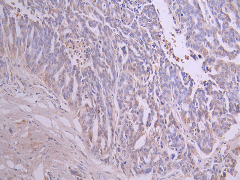 IHC image of CSB-RA005595MA2HU diluted at 1:50 and staining in paraffin-embedded human endometrial cancer performed on a Leica BondTM system. After dewaxing and hydration, antigen retrieval was mediated by high pressure in a citrate buffer (pH 6.0). Section was blocked with 10% normal goat serum 30min at RT. Then primary antibody (1% BSA) was incubated at 4°C overnight. The primary is detected by a Anti-Human lgG, Fcy Fragment Specific labeled by HRP and visualized using 0.05% DAB.