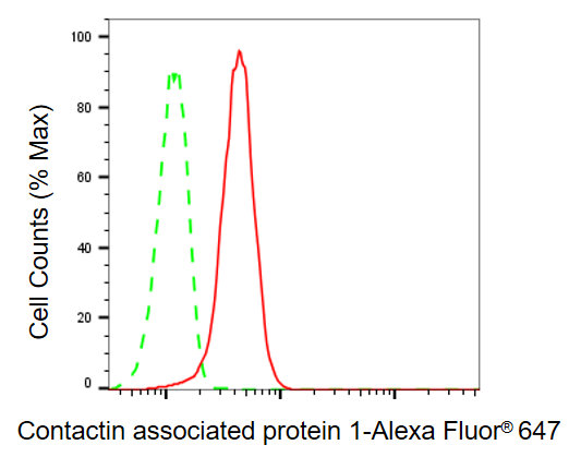 Flow cytometric analysis of contactin associated protein 1 expression in HepG2 cells using contactin associated protein 1 antibody. Green, isotype control; red, contactin associated protein 1.