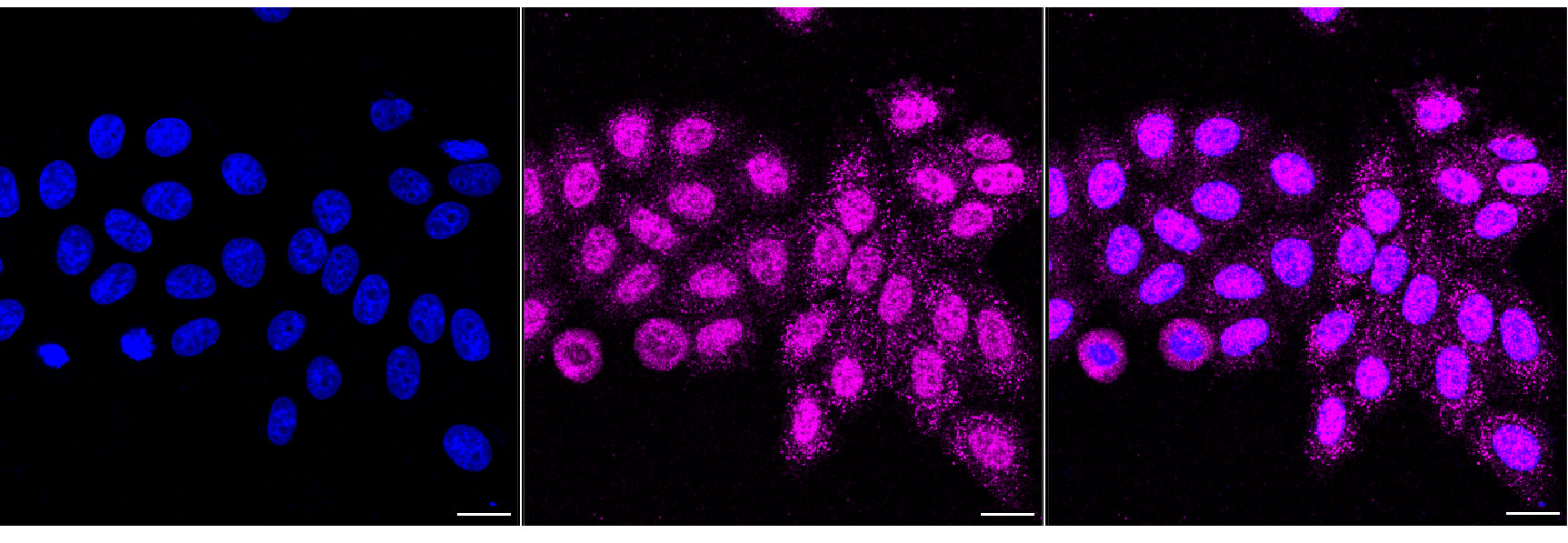 Immunocytochemical staining of HepG2 cells with Contactin associated protein 1 antibody. Nuclei were stained blue with DAPI; Contactin associated protein 1 was stained magenta with Alexa Fluor? 647. Images were taken using Leica stellaris 5. Protein abundance based on laser Intensity and smart gain: Medium. Scale bar, 20 μm.