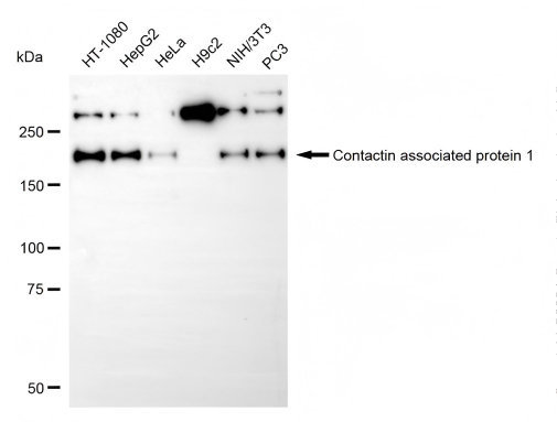 Western blotting analysis using contactin associated protein 1 antibody. Total cell lysates (30 μg) from various cell lines were loaded and separated by SDS-PAGE. The blot was incubated with contactin associated protein 1 antibody and HRP-conjugated goat anti-rabbit secondary antibody respectively.