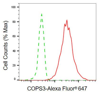 Flow cytometric analysis of COPS3 expression in HepG2 cells using COPS3 antibody. Green, isotype control; red, COPS3.